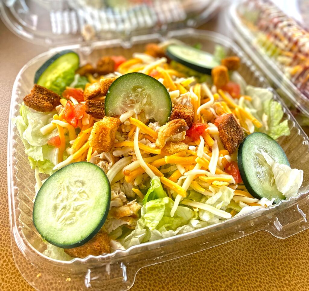 Your choice of chicken on a bed of fresh lettuce topped with tomatoes, cucumbers, cheese, and croutons