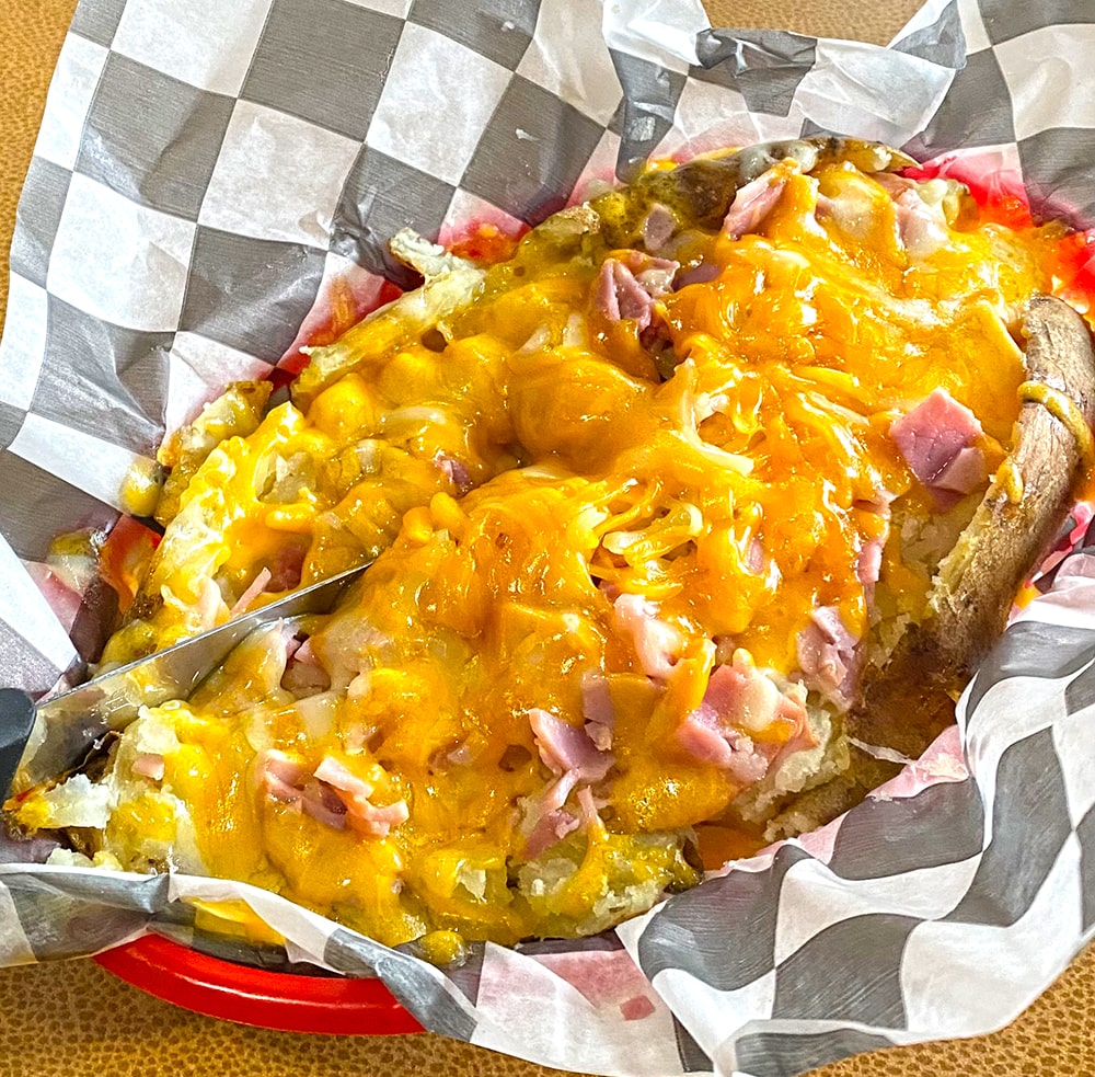 Sweet Baby Ray's BBQ sauce, cheddar cheese, bacon, and fried onion straws