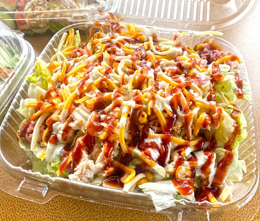 A flavorful salad complete with grilled chicken, tomatoes, bacon, roasted corn, and cheese topped with BBQ sauce and ranch